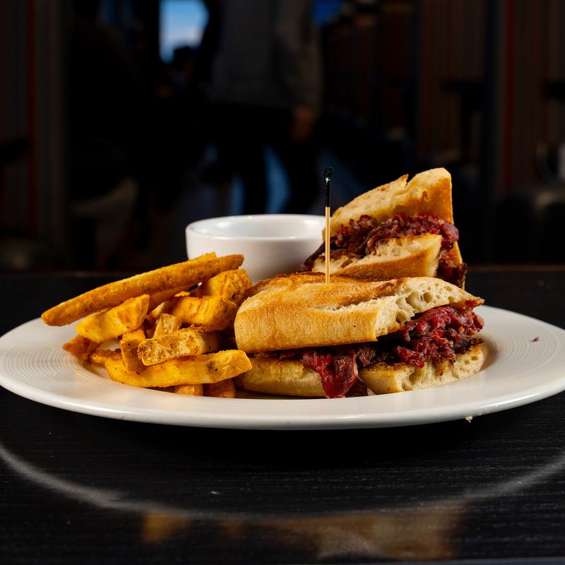 Number one seller! | Roasted prime rib, thinly sliced and served on a grilled French baguette with Au Jus • Make it Philly Style: Add sautéed mushrooms, bell peppers, onions, and Swiss cheese +$4.99