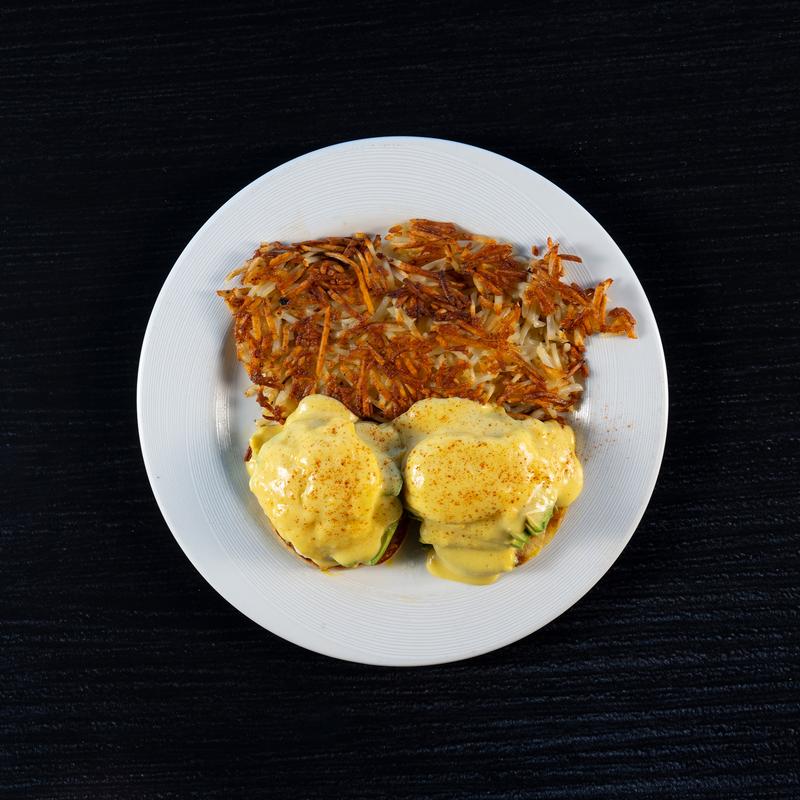 Toasted English muffin topped with avocado, tomato, poached egg and hollandaise. Served with hash browns or fruit