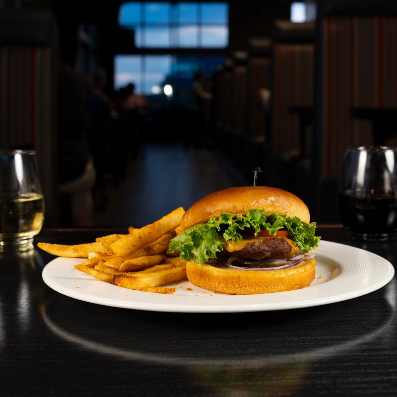Our signature deluxe cheeseburger with lettuce, tomato, onion, pickle, and cheddar cheese on a grilled brioche bun