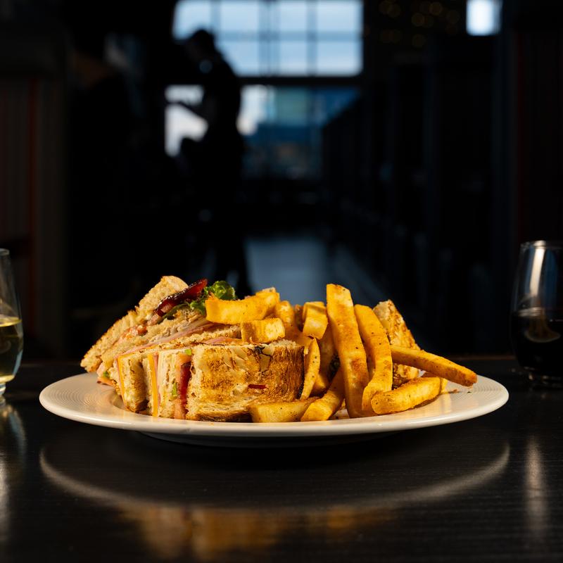 Triple-decker on rustic sourdough with turkey, ham, bacon, lettuce, tomato, mayo, Swiss and cheddar cheeses