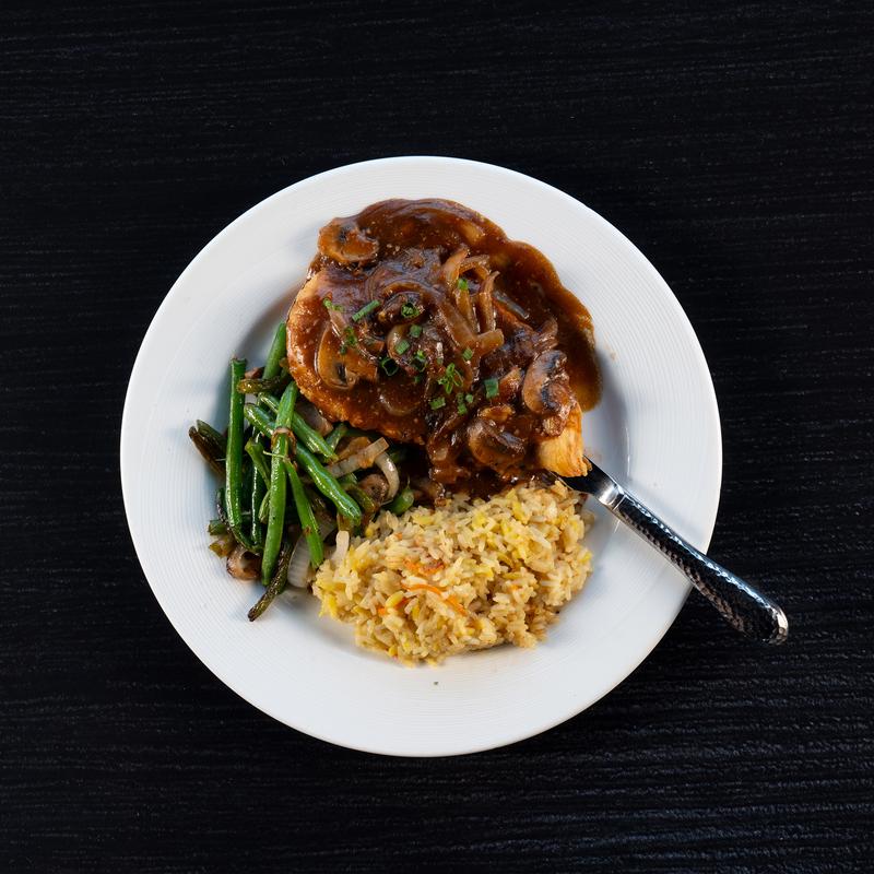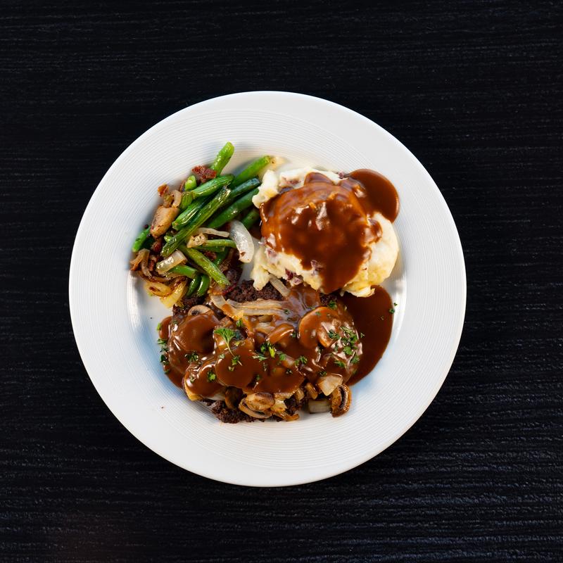 Ground beef steak topped with fresh sautéed mushrooms and onions in a