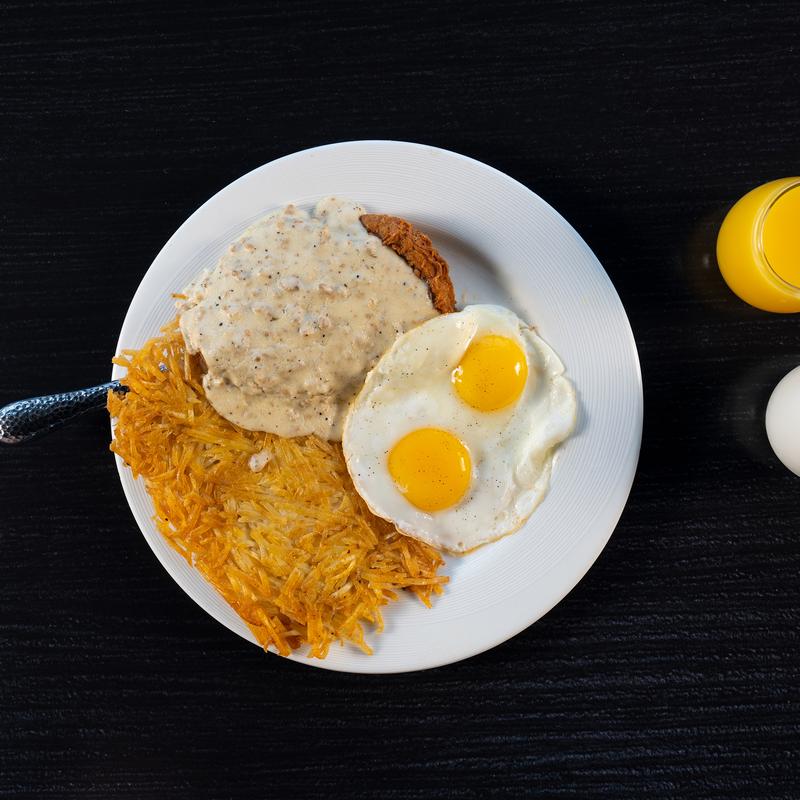 Crispy beef steak topped with our house made sausage gravy. Served with two eggs any style, golden hash browns and your choice of toast