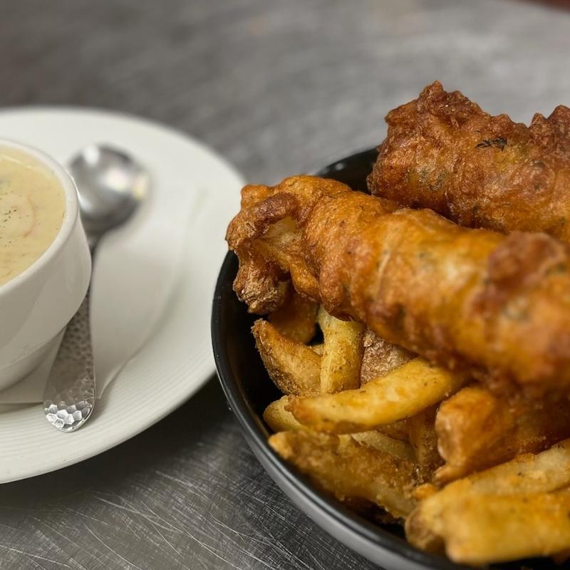 2-Piece Cod $20.99 | 3-Piece Cod $23.99 | 2-Piece Halibut Market Price • Our special tempura-battered Pacific Northwest cod or halibut, served with clam chowder, coleslaw, and fries
