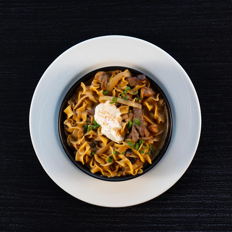 Roasted prime rib cut into julienned strips, simmered in a brown sauce with sautéed mushrooms, onions, and sour cream, served over buttered egg noodles, plus a choice of green salad or Caesar salad
